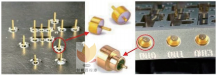 微波组件作为航空航天等领域的重要电子设备组件,向着高可靠性、高集成度、高气密性的趋势开展。微波组件中一般包含多个作为信号输入与输出端口的玻璃绝缘子(如图1所示),其中高频绝缘子起到微波信号的传输通道的作用,低频绝缘子起到馈电端口的功能。微组装时,对绝缘子提出了气密性、接地钎透性等要求,即:顺利获得壳体与连接器构成的气密封装,使内部电路与外部环境隔绝,尤其是在包含了大量裸芯片的微波电路中,必须保护电路免受外界恶劣环境的影响;接地效果上要求钎透率高,以保证较小的插入损耗和电压驻波比。