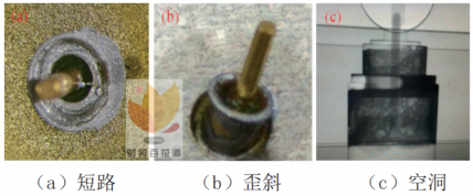 手工热台钎焊绝缘子一次焊接成品率只有75%,易出现绝缘子气密性差、短路、歪斜、空洞等缺陷,如图3所示,不合格类型占比见表1。以上故障绝缘子的返修耗时长、成功率低,为提高焊接成品率,本文对相关影响因素进行如下分析。