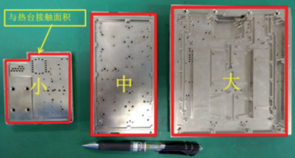 手工热台钎焊绝缘子时,需先将微波腔体置于热台上进行预热,再进行热吹风辅热。如图4所示,将热台温度设置为180 ℃,测量大、中、小三种微波腔体与热台的接触面积占比、腔体的实际温度,结果见表2。大、中、小三种腔体与热台的接触面积占比分别为6.5%、4.0%、10.5%。由于微波腔体多为正反面开腔结构,在热台上预热时只有很窄的侧壁与热台接触,因此热量主要顺利获得辐射而非传导的方式对腔体加热,导致腔体的最高温度均低于180 ℃,无法达到钎料的熔点,需要额外的热吹风辅助加热。