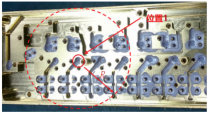 为测量腔体在热吹风下的实际温度,根据实际焊接流程,如图5所示,将某微波腔体置于170 ℃热台,将测温仪热电偶压于腔体上表面的位置1处,测试曲线如图6所示。每10 s读取一次温度数据。加热360 s后上表面温度升至117.5 ℃,开始使用400 ℃热吹风局部加热,70 s后当前绝缘子表面的预置焊料熔化,热吹风开始吹相邻的下一处绝缘子,此时测温热电偶继续测温和读数,直到热吹风移动至位置2(与位置1的距离R为6 cm),测温热电偶读数为179 ℃,基本可以判断位置1焊料此时已开始凝固。顺利获得温度测试可知,位置1处绝缘子熔化后,吹风在对距离其6 cm范围内的其余绝缘子加热时,该处绝缘子焊料几乎不断处于熔化状态,如图7所示。以某微波腔体为例,位置1处6 cm范围内约有48颗绝缘子,单颗加热时间以10 s计算,该处绝缘子处于熔化阶段的时间将可能达到480 s。