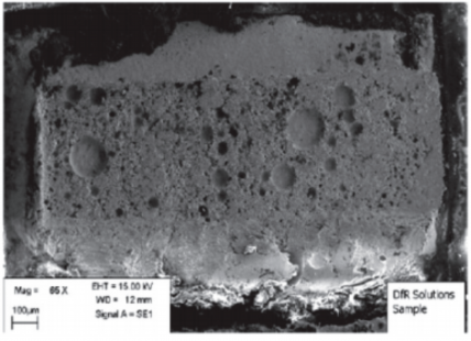 对于镀金腔体,由于锡铅焊料中的锡与金之间会形成大量金属间化合物,存在“金脆问题”,容易在焊缝形成大量孔洞,如图8所示。因此,焊料长时间熔化后极易导致焊缝变脆并产生大量孔洞,导致气密性难以满足。对于镀镍腔体,长时间加热导致助焊剂挥发失去活性,暴露在空气中的锡铅焊料易被氧化,影响钎料的流动性,导致钎料的填隙能力下降,另外松散的氧化渣使空气更容易停留在熔融得钎料内,更容易使焊缝产生孔洞。
