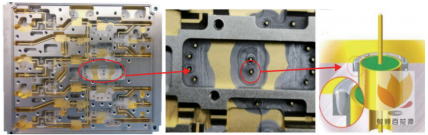 当使用热吹风对微波腔体加热时,一方面加热区域不可控,造成邻近绝缘子的钎料长时间处于融化状态;另一方面加热不均匀,造成腔体“内冷外热”,焊料更易在腔体表面大面积流布,导致绝缘子与安装孔之间填隙焊料量减少,进而造成焊缝漏气,如图9所示。此外,流布的焊料造成元器件的装配位置不平,影响后续装配。