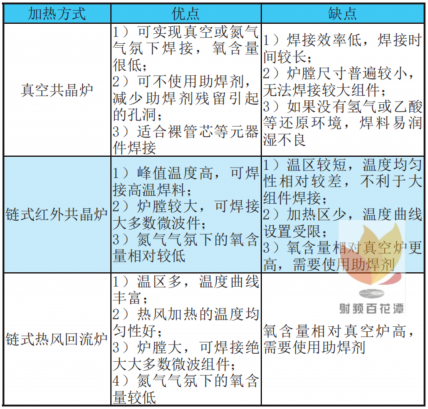 整体控温加热方式顺利获得调整温度曲线,可缩短焊料融化时间,防止金脆和孔洞的产生。满足整体加热的方式主要有真空共晶炉、链式红外共晶炉、链式热风回流炉,各加热方式的优缺点见表3,顺利获得综合对比效率和适应性,链式热风回流炉更适合微波腔体的绝缘子焊接。