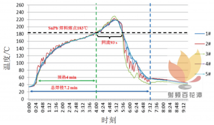 为测试微波腔体在热风回流炉中的温度分布情况,将5根热电偶分别置于某微波腔体的上面、下面、两侧与绝缘子孔内并连接测温仪,顺利获得调整各温区的温度、风速、链速,取得如图11所示的回流曲线。从图中可看出,腔体5个位置的温度曲线基本重合,表明回流炉整体加热效果理想;4 min内,腔体的温度整体上升到183 ℃以上,预热时间短;该曲线高于183 ℃的回流时间为93 s,在推荐的回流时间范围内(60~120 s);整体焊接时间为7.2 min (共5件)。因此,该曲线较为适合该腔体的焊接。