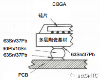 CBGA(Ceramic BGA,陶瓷封装BGA):CBGA最早源于IBM公司的C4倒装芯片工艺,它采用双焊料结构,芯片顺利获得 63/37 低熔点共晶焊料焊接在多层陶瓷基板的上表面,然后进行封装以提高其可靠性并给予机械保护。在多层陶瓷的下表面用 90/10 高温焊料制作焊球。