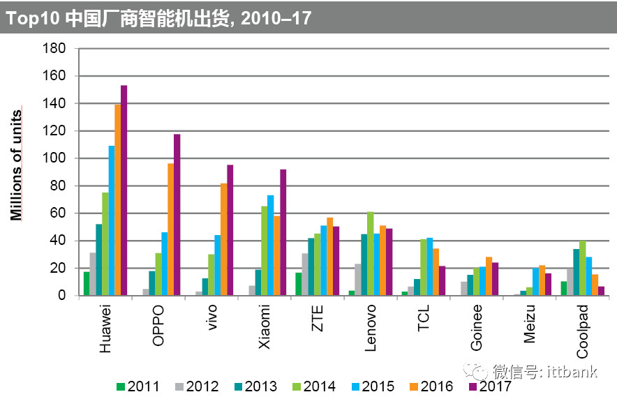 华为,OPPO,vivo和小米2017年中国手机市场出货继续增长,其中华为和OPPO增长均超过10%。