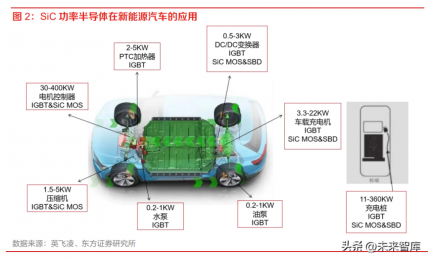 众多新能源汽车厂商竞相布局 SiC 器件。2018 年,特斯拉的 Model 3 首次采用意法半导体和英飞 凌的 SiC 逆变器取代了 Si-IGBT,逆变器效率提升了 5-8%。2020 年,比亚迪将自主研发制造的 SiC MOSFET 功率器件搭载在汉 EV 四驱高性能版上,实现了 200KW 的输出功率,功率密度提 升一倍。预计到 2023 年,比亚迪将实现 SiC 基车用功率半导体对硅基 IGBT 的全面替代,将整车 性能在现有基础上再提升 10%。现在,已有多家厂商推出了面向 HEV/EV 等电动汽车充电器的SiC 功率器件。未来随着 SiC 器件在车载充电器、DC/DC 转换以及充电桩中渗透率提升,市场空 间有望快速扩大。