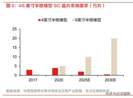 半绝缘型 SiC 衬底市场增长迅速,6 英寸晶片成为开展趋势。受益于 5G 基建加快布局和全球地 缘政治动荡,半绝缘型 SiC 衬底市场增长空间巨大。根据 Yole 数据,2020 年全球半绝缘型 SiC 衬底市场规模为 1.8 亿美元,较 2019 年同比增长 18%。此外,根据中国宽禁带功率半导体及应 用产业联盟数据,2020 年全球 4 英寸半绝缘型 SiC 晶片的市场需求约 4 万片,6 英寸约 5 万片, 两者需求占比不相上下;预计到 2025 年,4 英寸市场需求将减少至 2 万片,6 英寸成为开展趋势。
