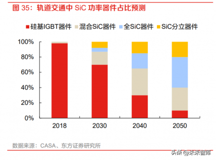 在大容量、轻量化和节能化要求下,轨道交通领域采用 SiC 大势所趋。随着轨道交通硅基功率器 件性能逐渐逼近理论极限,SiC 功率器件成为重点开展方向,以满足轨道交通系统对高功率密度、 低损耗和高可靠性等要求。与传统硅基 IGBT 牵引逆变器相比,全 SiC 牵引逆变器能耗能够降低 10%以上。2014 年日本小田急电铁新型通勤车辆配备了三菱电机 3300V/1500A 全 SiC 功率模块逆变器,开关损耗降低 55%,体积和重量减少 65%,电能损耗降低 20%~36%。根据 CASA 预 测,未来 30 年内,轨道交通应用中 90%的硅 IGBT 将被 SiC 器件或混合器件替代。Yole 数据显 示,铁路 SiC 市场将从 2019 年的 900 万美元增长到 2025 年的 1.18 亿美元,CAGR 达到 55%。