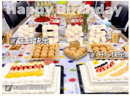 在热情响亮的生日歌中寿星们点燃蛋糕上的蜡烛,