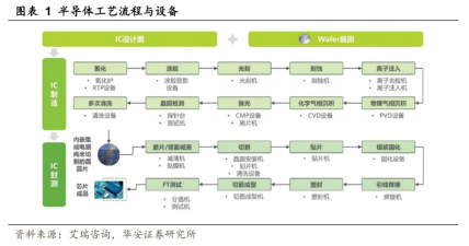 半导体工艺流程包括前道晶圆制造工序和后道封装测试工序。前道工序是晶圆制造工序。在前道工序中,晶圆经历了氧化、涂胶、光刻、刻蚀、离子注入、物理/化学气相沉积、抛光、晶圆检测、清洗等一系列步骤,每一步都需要相应的半导体制造设备。后道工序是封装测试工序。在后道工序中,尚未切割的晶圆片进入IC封测环节,经历磨片/背面减薄、切割、贴片、银浆固化、引线焊接、塑封、切筋成型、FT 测试,每一环节同样需要相应的半导体封装设备与半导体测试设备。最终得到芯片成品。