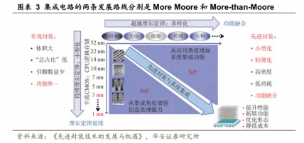 集成电路沿着两条技术路线开展,分别是More Moore和More-than-Moore。More Moore代表持续追随摩尔定律,致力于有助于先进制程的开展。这一路线的关键策略是顺利获得不断微缩互补金属氧化物半导体(Complementary Metal-Oxide-Semiconductor, CMOS)器件的晶体管栅极尺寸,以增加芯片晶体管数量,从而提升芯片性能。现在,量产芯片的工艺制程已开展至3 nm节点。全球范围内仅有少数企业,如台积电、英特尔和三星,具备10纳米及以下节点的制造能力。与More Moore相对应的是More-than-Moore,这一趋势旨在超越摩尔定律,将开展方向引向多样化。More-than-Moore采用先进封装技术,在一个系统内集成处理、模拟/射频、光电、能源、传感、生物等多种功能,从而实现了系统性能的全面提升。相对于传统封装方式,先进封装具有小型化、轻薄化、高密度、低功耗和功能融合等诸多优势,能够提升性能、拓展功能、优化形态、降低成本。