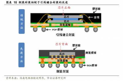 倒片封装与引线键合在工艺的不同之处在于:1)倒片封装将芯片倒置,芯片正面倒扣在基板上;2)倒片封装舍弃金属引线,利用凸块连接,需要进行凸块键合。
