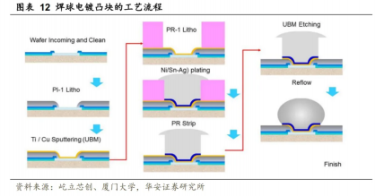 倒片封装的关键工艺是Bumping。凸块是定向生长于芯片表面,与芯片焊盘直接相连或间接相连的具有金属导电特性的凸起物,按材质可分为金凸块、焊球凸块、铜柱凸块。主流的凸块工艺均采用圆片级加工,即在整片圆片表面的所有芯片上加工制作凸块,常用方式有蒸发方式、印刷方式和电镀方式。焊球电镀凸块的工艺流程为:第一时间,采用溅射或其它物理气相沉积的方式在圆片表面沉积一层Ti/Cu作为电镀所需种子层;其次,在圆片表面旋涂一定厚度的光刻胶,并运用光刻曝光工艺形成所需要图形;然后,圆片进入电镀机,顺利获得控制电镀电流、时间等,从光刻胶开窗图形的底部开始生长并得到一定厚度的金属层作为UBM;最后,顺利获得去除多余光刻胶、UBMEtching及回流工艺实现电镀凸块制作。