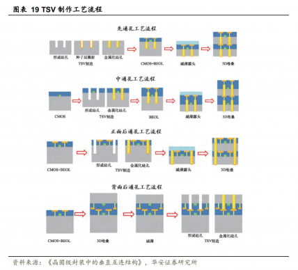 根据TSV被制作的时间顺序,有3种类型的TSV工艺。分为先通孔工艺(Via First)、中通孔工艺(Via Middle)和后通孔工艺(Via Last),分别指TSV制作在晶圆制作工艺中的前、中或后段。