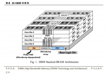 HBM使用2.5D/3D封装技术打破“内存墙”制约,成为AI及高性能计算需求下的主流方案。高带宽内存(High Bandwidth Memory, HBM)顺利获得逻辑芯片和多层的DRAM堆叠来实现高速数据传输,突破了带宽瓶颈,成为AI训练芯片的首选。第一代HBM的架构如下图所示,由4层DRAM和逻辑芯片堆叠在一起,每层之间顺利获得TSV和微凸点连接。每个HBM有8个通道,每个通道有128个I/O,因此每个HBM有1024个I/O,即合计1024个TSV位于HBM的中间区域。存储器和处理器顺利获得无源转接板上的再布线层(RDL)将HBM逻辑芯片的端口物理层(Port Physical Layer, PHY)与处理器的PHY相连。HBM的性能较传统GDDR5更具优势,GDDR5的带宽最高可达32 GB/s,而HBM1、HBM2和HBM2的带宽分别达到了128 GB/s、307 GB/s和819 GB/s。其中,HBM内部的DRAM堆叠属于3D封装,而HBM与芯片其他部分合封于硅中介层上属于2.5D封装。