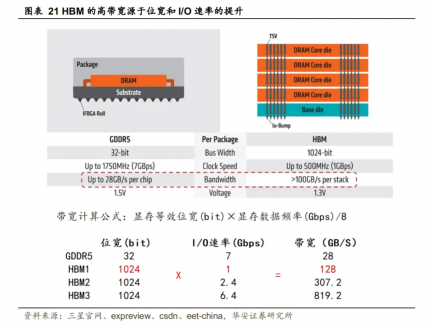 HBM的带宽提升源于堆栈式封装带来的高位宽以及I/O速率的提升。1)位宽:HBM的位宽是GDDR5的32倍。显存带宽是指显示芯片与显存之间的数据传输速率,带宽的计算公式为:显存带宽(GB/s) = 显存实际频率(MHz) × 显存数据倍率 × 显存等效位宽(bit) / 8。GDDR5的频率可达1750 MHz,采用4倍速率机制,其等效频率为7000 MHz,但GDDR5内部I/O位宽仅32 bit;相比之下,HBM的频率为500 MHz,采用2倍速率机制,等效频率为1000 MHz,但HBM内部I/O位宽高达1024 bit,将带宽提升至128 GB/s。HBM之所以能实现32倍于GDDR5的I/O位宽,是因为它采用了堆栈式设计,顺利获得TSV堆栈方式将DRAM裸片垂直堆叠放置,从而实现在相同底面积上布置了数倍的DRAM颗粒,以达到更高的I/O数量。2)I/O速率:在数值上,显存速率和显存频率是相等的,使带宽计算公式简化为:显存带宽(GB/s) = 显存数据速率(Gbps) × 显存等效位宽(bit) / 8。这是因为显存速率表示每秒传输的数据位数,单位为bps (bits per second)。显存频率以MHz为单位,频率单位赫兹的本质就是,描述了单位时间内完成周期性变化的次数。因此,在数值上,显存速率和显存频率是相等的。根据JEDEC固态技术协会发布的HBM3标准,HBM3定义高达6.4 Gb/s的数据速率,堆栈中的DRAM芯片数量(四到十六个)及其具体容量(每堆栈4 GB到64 GB)不等,计算得到初始HBM3堆栈可给予每堆栈819GB/s的传输带宽。
