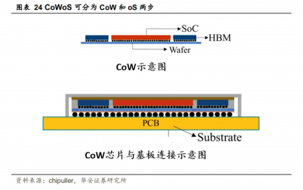 HBM的高密度连接和短互联间距,要求台积电的CoWoS封装技术。CoWoS是台积电于2012年研发的一种2.5D集成封装技术,可分为CoW和oS两步,CoW(chip on wafer)是将计算核心、I/O die、HBM等芯片封装在硅中介层上;然后再把CoW芯片整体封装在基板(Substrate)上,即oS(on substrate)环节。CoWoS可以节省空间,实现HBM所需的高互联密度和短距离连接;还能将不同制程的芯片封装在一起,在满足AI、GPU等加速运算的需求的同时控制成本。现在所有先进的AI计算芯片都使用HBM,而几乎所有HBM都封装在CoWoS上。