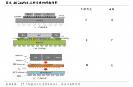 根据中介层材料的不同,CoWoS有三种变体:CoWoS-S(中介层是Si衬底)、CoWoS-R(中介层由RDL构成)和CoWoS-L(中介层由Chiplet和RDL组成),其中CoWoS-S为量产主要配置。CoWoS-S利用硅片作为桥梁,芯片互联密度最高;出于成本的考虑,CoWoS-R采用有机转接板,但也导致芯片互联密度较低;CoWoS-L将小硅桥安装在有机转接板中,仅在芯片链接部分使用硅片,实现邻近芯片边缘的高密度连接,生产成本和性能介于CoWoS-R和CoWoS-S之间。
