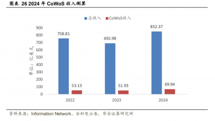 2024年,CoWoS预计为台积电带来70亿美元营收。AI需求驱动下,CoWoS在台积电营收的比重逐渐上升。根据Information Network估计,2022/2023/2024年CoWoS收入占台积电营收的比例将分别达到7.00%/7.49%/8.21%。以台积电2024年全年营收指引852.37亿美元估算,AI将带来约69.94亿美元的CoWoS营收,较2023年同比增长34.69%。