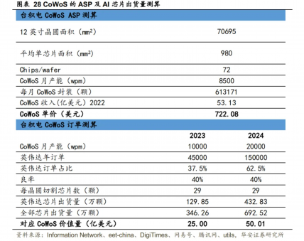 根据我们的测算,CoWoS封装的单价为722.08美元/颗,2023年/2024年基于CoWoS的芯片出货量将达到346万颗/693万颗,其中供给英伟达的芯片分别为130万颗/433万颗。按照12英寸晶圆面积70695 mm²和H100、A100、Epic Genoa、MI300四种AI芯片平均面积980mm²,测算得到每张晶圆上芯片数约72颗。根据Information Network给出的2022年CoWoS月产能为8500片以及前文测算的2022年台积电CoWoS收入,得到单颗芯片CoWoS封装价格约为722.08美元。而根据DigiTimes的报道,2023年CoWoS年产能约12万片,2024年将冲上24万片,其中英伟达将取得14.4-15万片。由于这些芯片多在7nm和5nm节点生产,保守假设良率为40%。我们以英伟达2023年和2024年分别取得4.5万片和15万片的产能来算,预计英伟达出货量约130万颗和433万颗。全体AI芯片出货量约346万颗和693万颗,对应2023年/2024年CoWoS将产生25亿美元/50亿美元收入。