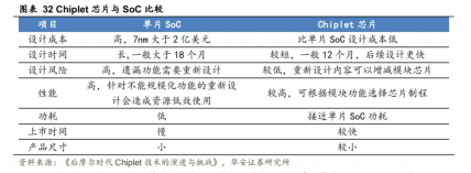 Chiplet具备良率、成本、异构计算优势,适用于复杂功能的定制化需求。由于Chiplet由多颗芯粒组成,单颗芯粒的面积较小,其良率高。直接设计一整块SoC的面积较大,可能导致较低的良率,从而带来高昂的成本。此外,Chiplet技术支持封装内部的异构集成,可以根据模块功能选择芯片制程,针对特定功能模块设计专用的高性能芯片,对于其他通用芯片粒采用成熟制程。