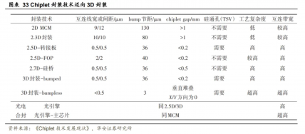 Chiplet封装技术也正迈向3D封装,互联节距持续缩小。Chiplet封装广泛使用各类先进封装技术,包括2D MCM、2.3D封装、2.5D-转接板、2.5D-FOP、2.7D-硅桥、3D封装-bumped、3D封装-bumpless等。封装结构已从2D封装开展到3D封装,互联间距从12μm缩短至0.5μm以下,bump节距从过去的130μm缩小至3μm。互连带宽逐步增加,互连质量逐步提升。