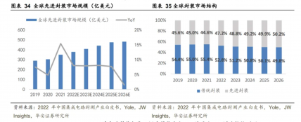 AI及高性能计算需求旺盛,先进封装景气度高于整体封装行业。根据JW Insights和Yole,全球先进封装市场规模有望从2022年378亿美元上升至2026年482亿美元,CAGR约为6.26%。从全球封装市场结构来看,2022年先进封装的市场份额为47.2%。由于先进封装市场增速超过传统分装市场增速,先进封装的市场份额将持续提升,预计至2026年将达到50.2%。