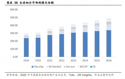 现在先进封装仍然以倒片封装为主,3D堆叠和ED增速较快。根据JW Insights和Yole,Flip-chip是市场规模最大的先进封装工艺,2022年市场规模达到290.94亿美元,占比76.7%,其后为3D堆叠(38.33亿美元)、Fan-out(22.05亿美元)、WLCSP(26.98亿美元)、ED(0.78亿美元)。在各先进封装工艺中,成长性较高的是3D堆叠和ED。3D堆叠封装2022年市场规模为38.33亿美元,预计2026年可以达到73.67亿美元,2022年-2026年CAGR为18%,主要是受高性能运算、AI等领域的需要拉动。嵌入式基板封装(ED)是一种先进的封装技术,在5G硬件和CIS等场景有较大的增量空间。2022年ED的市场规模为0.78亿美元,预计2026年可以达到1.89亿美元,2022年-2026年CAGR为25%。