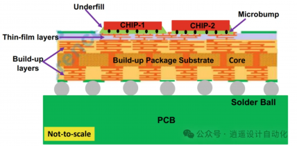 这种技术在构建封装基板顶部具有薄膜层。这些薄膜层的金属线宽和间距可以小到2/2 μm,支持带有微凸点的倒装芯片。