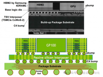 在这种技术中,诸如GPU和高带宽存储器(HBM)等组件使用C2微凸点附着到无源TSV中间层上。然后整个模块使用C4凸点连接到封装基板。