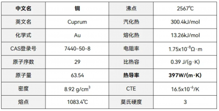 铜(Copper, Cu),原子序数为29,为过渡金属,铜原子量为63.54,密度为8.92g/cm3,熔点为1083.4℃,沸点为2567℃,电离能为7.726 eV,莫氏硬度为3,电阻率约为1.75x10-8Ω·m,热导率为397W/(m·K)。铜的电导率及热导率仅次于银,是工业中广泛应用的导电、导热金属。