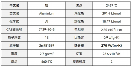 铝(Aluminium, Al),银白色轻金属,质软,密度为2.7g/cm3,熔点为660.4℃,沸点为2467℃,不溶于水,溶于碱、盐酸、硫酸。纯铝导热性好,热导率约为 270W/(m·K),导电性很好,仅次于银、铜。如果按单位质量计,铝的电导率则超过了铜,在远距离传输时经常代替铜。