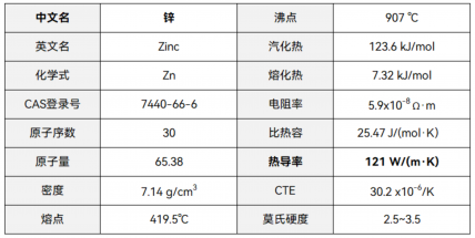 锌的化学性质活泼,常温下,在空气中表面易生成一层薄而致密的碱式碳酸锌膜,阻止进一步氧化;225℃后,锌剧烈氧化,表面形成带氧化锌外壳的复合锌粒子。锌热导率约为121W/(m·K),是制备导热聚合物的重要金属填料,锌-铜合金-黄铜的热导率高达116W/(m·K)。