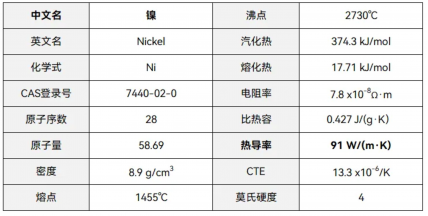 镍质地坚硬,有铁磁性和良好的可塑性、延展性,导电、导热。常温下,镍在潮湿空气中表面形成致密氧化膜,阻止继续被氧化,且具有耐碱、盐溶液腐蚀。镍在干燥空气中不被氧化,高温下氧化成NiO,控制氧化温度和时间,可生成表面具有NiO的核壳结构镍粒子。简单化合物中以+2价最稳定。金属镍热导率约为91W/(m·K),镍粉是制备磁性导热聚合物的重要金属填料。