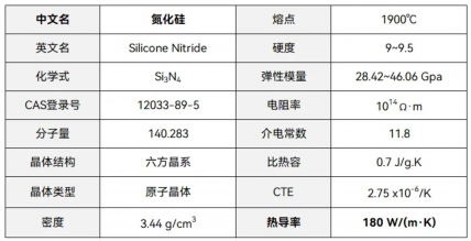 氮化硅(Silicone Nitride),化学式为Si3N4,分子量为140.28,为原子晶体,正八面体结构,灰色、白色或灰白色六方晶系,有两种变体,即α型六方密堆积结构和β型似晶石结构。Si3N4有杂质或过量硅时呈灰色,密度为3.44g/cm3,硬度为9~9.5,熔点为1900℃(加压下),比热容为0.71J/(g·K),生成热约为751.57kJ/mol,CTE为2.75x10-6/K(20~1000℃)。