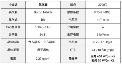 H-BN是陶瓷中最好的高温绝缘材料,室温电阻率为1014Ω·cm,2000℃时仍达103Ω·cm;H-BN具有高击穿电压,高温击穿电压为3kV/mm;H-BN具有低介电损耗,108Hz时为2.5x10-4,介电常数为4,可透微波和红外线。H-BN摩擦系数低至0.16,高温下不增大。H-BN中由于B与N具有较大的电负性差异,使得其带隙达5.5~6.0eV,可认为是绝缘性能优良的半导体。