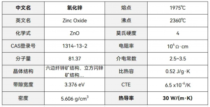 ZnO的密度为5.606g/cm3,熔点为1975℃,沸点为2360℃。ZnO的热稳定性和热传导性较好,室温热导率约为30W/(m·K),而且沸点高,CTE低,约为6.5 x10-6/K。ZnO作为聚合物的导热填料已经获工业应用。