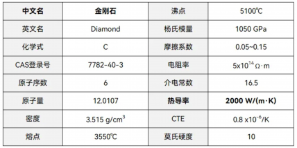 金刚石,是自然界中热导率最高的物质,常温下热导率(Type Ⅱ Diamond)可达2000 W/(mK),热膨胀系数约(0.86±0.1)*10-6/K,且室温下绝缘。另外,金刚石还具有优异的力学、声学、光学、电学和化学性质,使其在高功率光电器件散热问题上具有明显优势。