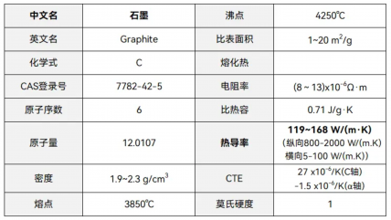 石墨质软,硬度1~2,密度1.9~2.3g/cm3,比表面积为1~20m2/g,熔点为3850℃,沸点为4250℃,是最耐温的矿物之一。CTE仅有铜和铝的1/10~1/20,导电性比一般非金属矿高100倍,石墨化程度越高,热导率就越高,导热性超过钢、铁、铅等金属材料。
