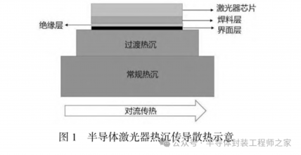半导体激光器的封装结构如图 1 所示,激光器热量绝大部分产生在芯片的有源区,顺利获得焊料层、绝缘层、界面层传导至过渡热沉和常规热沉,常规热沉与冷却介质接触形成对流换热,将热量散出。