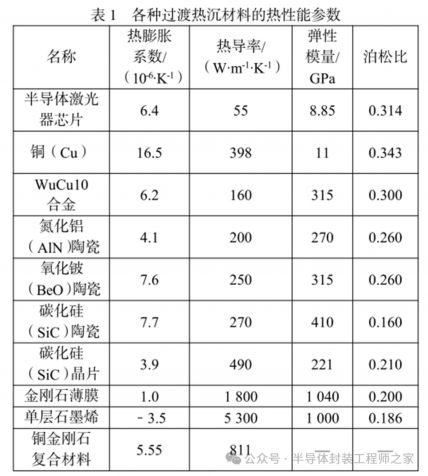 理想的过渡热沉材料应具有高热导率,同时能与激光器芯片的热膨胀系数相匹配。常用的过渡热沉材料有氮化铝陶瓷、氧化铍陶瓷、碳化硅陶瓷、钨铜合金、碳化硅晶片、金刚石薄膜片等,其相关热性能参数如表 1 所示。