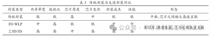 封装技术的开展史大致分为 4 个阶段:第 1 阶段(1970 年以前)是元件插装时代,主要采用直插型封装(DIP)等技术,电子元件被手工插入电路板的孔中,尺寸较大且制造过程相对简单;第 2 阶段(1970—1990年)是表面贴装时代,主要采用小外形封装(SOP)等技术,元件开始直接贴装在印刷电路板表面,从而实现更紧凑的设计;第 3 阶段(1990—2000 年)是面积阵列封装时代,主要采用球栅阵列封装(BGA)、倒装芯片等技术,这些封装技术进一步提高了芯片的集成度和性能,同时增强了电路板对热应力和机械应力的抵抗能力;第 4 阶段是 2000 年以来的先进封装时代,特点是采用堆叠、异构集成、精密互连等技术。传统封装与先进封装 (以 2.5D/3D 和 FO-WLP 为例)对比如表 3所示。