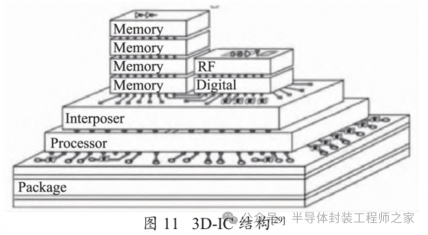 随着半导体工艺技术不断缩放,设计复杂度不断增加,传统的二维集成芯片设计赶不上摩尔定律的缩放趋势。此外,在高端性能封装中,处理芯片和存储芯片对高带宽、低延迟有严格要求[28],于是业界从三维的概念寻找解决方案。3D 集成(3D-IC)是指顺利获得 TSV 实现不同芯片层之间电学互连的 3D IC 堆叠技术,其结构如图 11 所示。3D 集成包括 3D IC 封装、3D IC 集成和 3D Si 集成,后两者使用 TSV,而 3D IC 封装不使用TSV。3D-IC封装可容纳多个异构裸片且各功能模块可采用不同的制程节点,这可大大降低成本并提高产品上市速度。此外 3D-IC 支持更小的尺寸,可以节省电路板和终端产品的空间,是小型移动设备的理想选择。