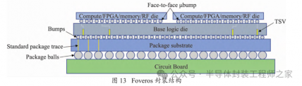 2018 年 12 月,英特尔首次展示了 Foveros 封装技术,该技术也叫三维面对面异构集成芯片堆叠,它是一种堆叠式芯片封装技术,可以将多个不同制程的芯片层顺利获得微型互联线连接在一起,实现了高速、低功耗的芯片互连,其封装结构如图 13 所示。