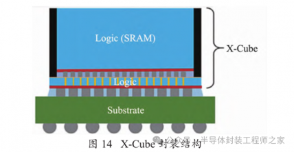 X-Cube 是第一代 3D IC 晶圆级逻辑堆叠与集成技术,“X”表示 3D 中扩展的互连 密 度 和 扩展 的 功能[32]。X-Cube 封装结构如图14 所示,不同于 2D 平行封装,X-Cube 3D 封装允许多枚芯片在堆叠封装的方式下协同工作,顺利获得 TSV 技术将 SRAM 存储芯片堆叠到主芯片上方,这种设计可以释放更多空间,使其他组件得以更紧凑地堆叠在一起。此外,其顺利获得 TSV技术实现芯片之间的连接,不仅降低了功耗,而且大幅提高了数据传输速率。