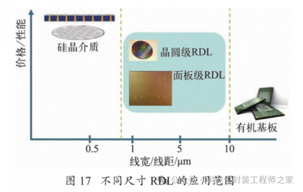 RDL 是指在晶圆表面沉积金属层和介质层,并形成金属布线,对 I/O 端口进行重新布局,将其布局到新的区域,并形成面阵列排布。采用 RDL 能够支持更多的 I/O 数量,使 I/O 间距更灵活、凸点面积更大。此外RDL 可以将不同种类的芯片连接在一起,在 3D 集成中,TSV 用于完成同种堆叠芯片的电气互联,而不同类型堆叠芯片的连接则需要 RDL 来实现。不同尺寸RDL 的应用范围如图 17 所示,不同线宽 / 间距(L/S)的 RDL 具有不同的应用范围,现在主流 RDL 的 L/S仍在 5 μm 以上。