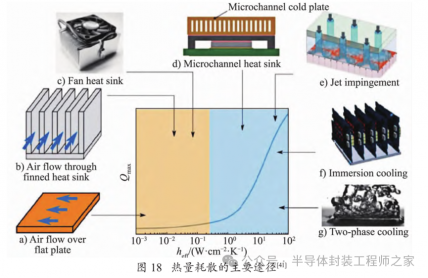 7 种常见的封装体热量耗散途径如图18 所示[39-41]。Qmax 为可耗散的最大功率,heff 为有效传热系数。虽然存在很多散热途径,但随着芯片性能和功耗的不断提升,产生的热量越来越高,这对封装的散热性能提出了更高的要求。随着封装集成度的不断提高,业界要求封装体能够为处理芯片给予热流密度高达 1000 W/cm2的热量耗散能力[42]。在先进封装中,3D 封装因其芯片堆叠方式,其散热问题不断很受关注。3D 封装散热问题主要存在于以下 4 个方面:(1)3D 封装需要将多个芯片堆叠在封装体内,芯片堆叠后发热量增加,但散热面积并未增加,这导致发热密度增加;(2)多芯片堆叠,热源相互接触,热耦合现象增强;(3)内埋置基板中的无源器件发热,由于有机或陶瓷基板散热能力较差,会产生严重的热问题;(4)封装尺寸不断缩小,组装密度不断增加,使得封装的散热设计不易进行。