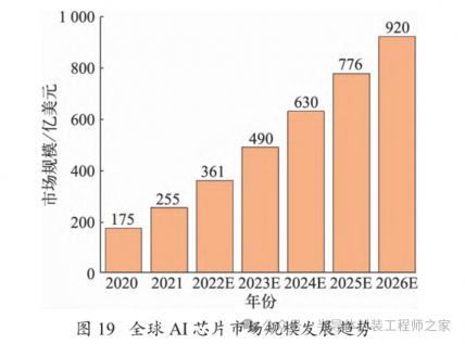 随着人工智能的火爆,面向 AI 应用的高性能芯片的需求持续增加,Frost&Sullivan 的统计数据显示,预计在 2020—2026 年,全球 AI 芯片市场规模将以29.3%的复合增长速度持续扩大,2023 年的市场总额将达到 490 亿美元,全球 AI 芯片市场规模开展趋势如图 19 所示。