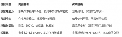 在低空飞行器的电子系统中,陶瓷基板凭借高热导率(AlN达180-220 W/m·K)、低介电损耗(LTCC基板tanδ<0.001)、优异机械强度(抗弯强度>400 MPa),成为功率模块、射频器件、传感器的首选载体。相较于传统FR-4或金属基板,其优势显著: